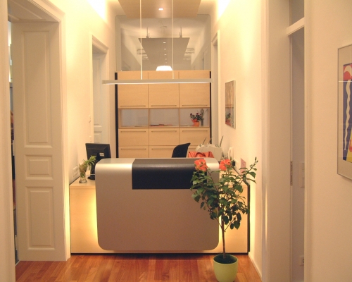 eine altbauwohnung in klagenfurt wurde 2003 zu einer großzügigen zahnarztpraxis umgestaltet. der alte vorraum dient nun als zentrale anlauf- und verteilerstelle. röntgen- und nebenräume lockern den linearen behandlungsbereich farblich auf.