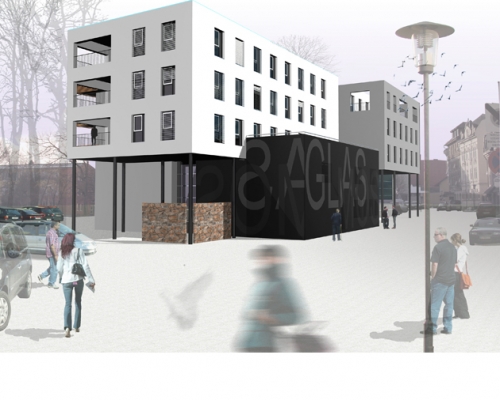 durch die geplante, 3 geschossige überbauung des bestehenden werksgebäudes der fa. glas moser, wird das vorherrschende neubauensemble stilgerecht abgerundet.